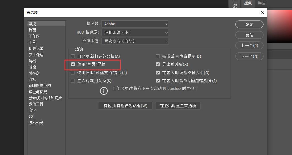 打开PS软件,从编辑-首选项-常规点击进去,在常规中勾选“停用主页屏幕”,然后重启PS软件即可。